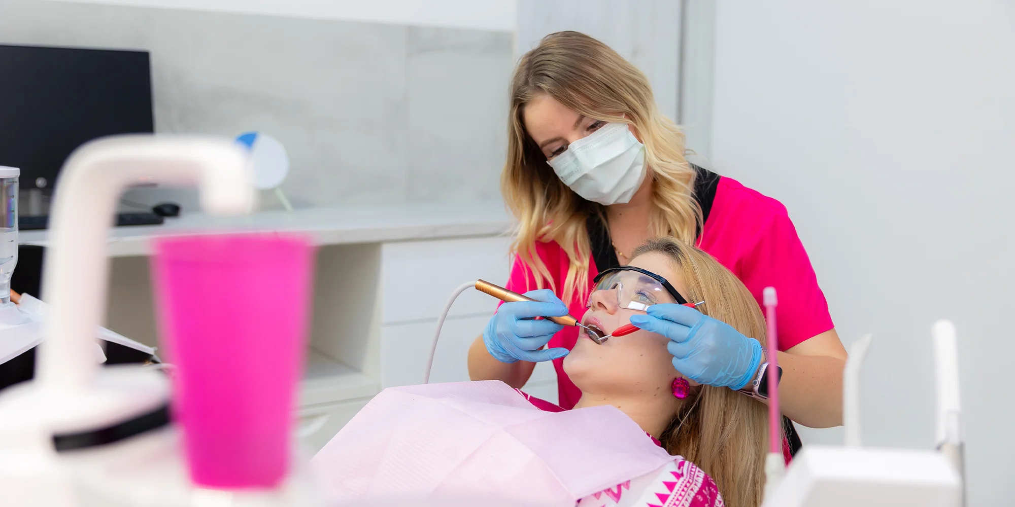 - Vyleštenie a zafluoridovanie: Vyleštenie zubov pre hladký povrch a aplikácia fluoridu pre posilnenie zubnej skloviny.