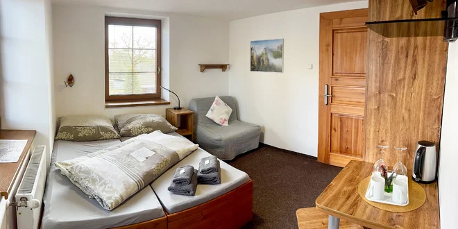 Vaším malým kráľovstvom sa stane dvojlôžková izba. Jej súčasťou je spálňa s pohodlnou manželskou posteľou, rýchlovarná kanvica a set na prípravu kávy a čaju. Nechýba ani kúpeľňa so sprchovacím kútom a toaletou. Dlhé večery si tu môžete skrátiť sledovaním televízie či surfovaním na internete vďaka Wi‑Fi pripojeniu zdarma.