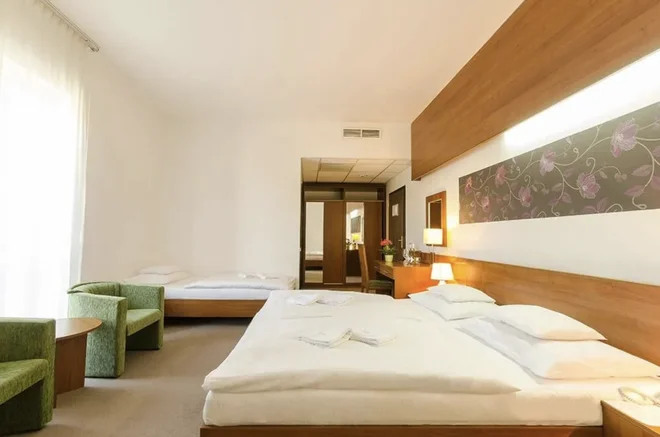 Hotel ponúka tri kategórie klimatizovaných izieb s balkónmi – a každá vás niečím poteší. Standard (21 m²), ideálna pre dvojicu, sa môže pochváliť voľbou medzi manželskou postelou alebo oddelenými lôžkami, kúpeľňou so sprchou, fénom, LCD televízorom a mini‑chladničkou, a samozrejme aj so súkromným balkónom, kde si môžete vypiť svoju rannú kávu. Superior Double (25 m²) disponuje prístelkou navyše – komfortnou pevnou posteľou pre tretieho hosťa. Najväčším ťahákom je Junior Suite (45 m²), ideálna pre rodiny alebo priateľov, s dvoma samostatnými spálňami, každá s manželskou posteľou (alebo dvoma lôžkami), dvoma balkónmi, klimatizáciou, LCD TV, mini‑barom a kúpeľňou so sprchou a fénom – jednoducho hotelová pohodička s extra priestorom. Samozrejmosťou je bezplatné pripojenie na Wi‑Fi a parkovanie zadarmo. Aktívnych hostí isto poteší aj neobmedzený prístup do fitness.