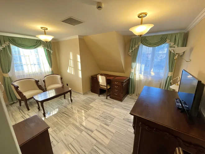 Odporúčame: Obzvlášť očarujúca je izba Superior mezonet, kde sa spálňa nachádza na poschodí a je z nej nádherný výhľad do širokého okolia. Dole potom nájdete posedenie s kreslami a stolíkom a tiež kúpeľňu.