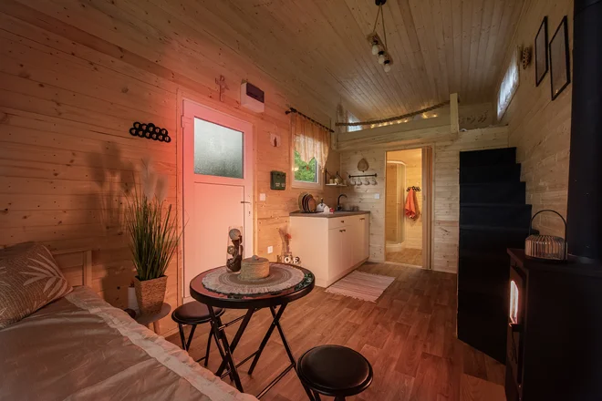 Pokojné ubytovanie späté s prírodou je zariadené v Boho štýle. V malom, no útulnom priestore, kde všetko vonia drevom, nájdete všetky vymoženosti, ktoré vám doprajú pohodlie: