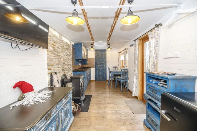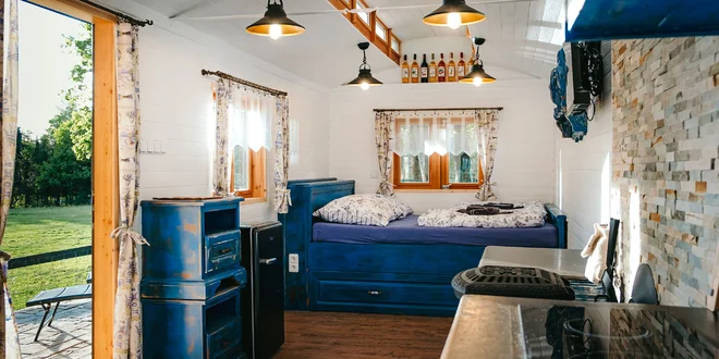 Vyspia sa tu až 3 osoby, vo vnútri je manželská posteľ a je možné pridať prístelku. V kuchynskom kútiku je všetko vybavenie vrátane riadu, indukčnej dvojplatničky, rýchlovarnej kanvice a chladničky s malým mrazničkou. Zakúriť si môžete v krbových kachliach, drevo je v cene. Nechýba samozrejme ani kúpeľňa so sprchovacím kútom, toaletou a tečúcou teplou vodou. A aby ste zostali v spojení so svetom (ak budete chcieť), je tu TV a internet.