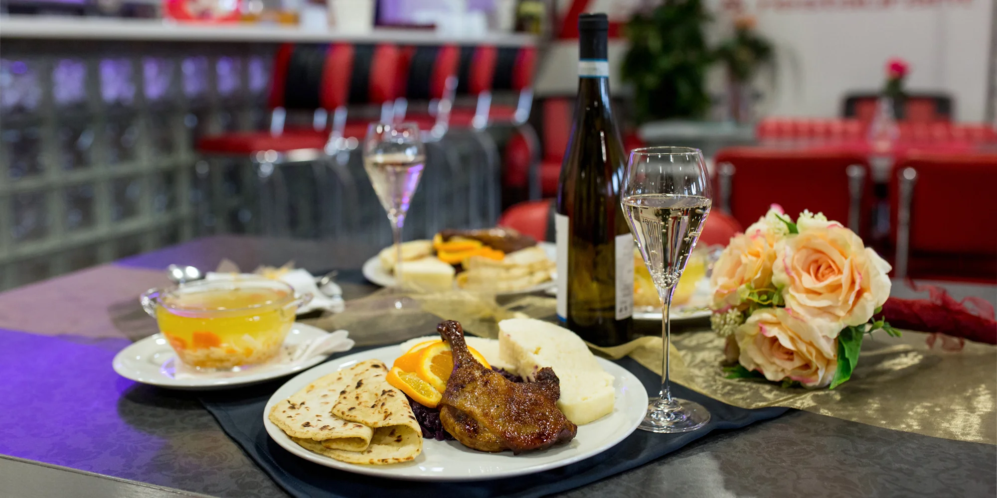 Kačacie hody pre dvoch s vývarom, lokšami a fľašou sektu