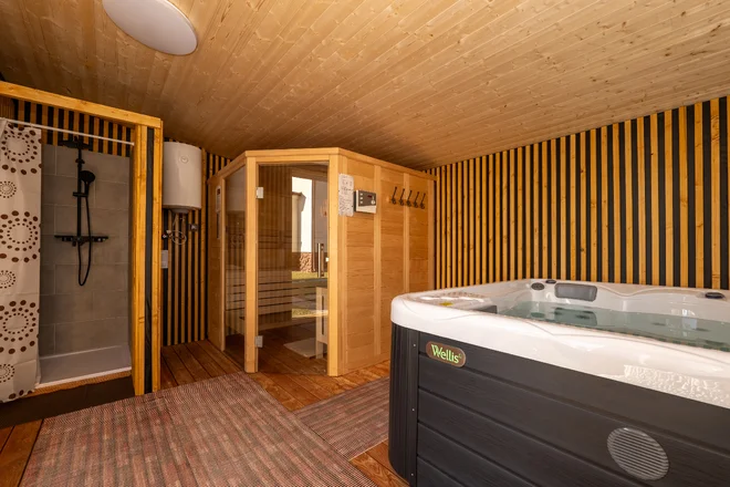- K dispozícii je: vonkajšia fínska sauna + vonkajšia vírivka