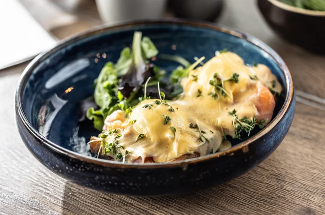 • 150 g Vajce Benedikt – chlieb, holandská omáčka, Losos / Prosciutto (A: 1, 3, 4, 9)