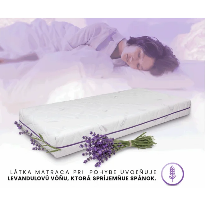 Ortopedický matrac Lema Levanduľa – spája pohodlie, aromaterapiu a ortopedickú podporu chrbtice. Jadro vytvorené z orthoDreamPUR peny s mikromasážnou štruktúrou zlepšuje prekrvenie a uvoľňuje svaly, zatiaľ čo levanduľové mikrokapsule prinášajú jemnú vôňu a upokojujúce účinky.