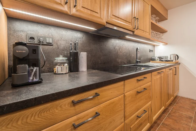 • Vybavená kuchynská linka (dvojplatnička, umývačka riadu, chladnička s mrazničkou, rýchlovarná kanvica, mikrovlnná rúra, Nespresso kávovar vrátane kapsúl, hriankovač, toustovač)