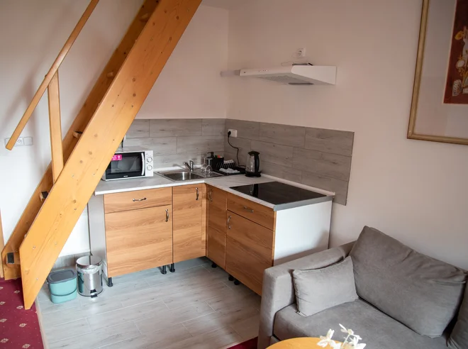 V ponuke penziónu je dvojpodlažný apartmán a rodinný apartmán s 2 spálňami. Prvá varianta ponúkne manželskú posteľ v obytnom podkroví, ktoré je prístupné po schodoch z obývacej izby. Tá je vybavená rozkladacou pohovkou na prespanie dvoch osôb, stolom pre 4 osoby, chladničkou, kuchynským kútom s varnou doskou, mikrovlnkou a ďalším obvyklým kuchynským vybavením. Apartmán má predsieň a samostatné sociálne zariadenie.