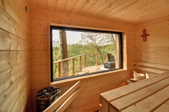 Samozrejmosťou je aj kúpeľňa so sprchou a WC. Dokonca nechýba ani práčka so sušičkou. Kúpeľňa je potom prepojená s fínskou saunou, kde si môžete užívať, ako dlho len budete chcieť – jej využitie je neobmedzené. Saunovací rituál potom zavŕšite ochladením pod sprchovou hlavicou priamo pri saune, tí odvážnejší sa ochladia priamo v rieke, ku ktorej to máte len 50 m.