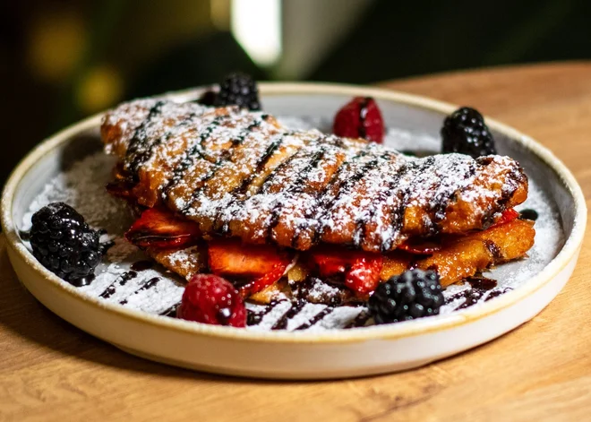 - 120 g French Toast Croissant - mascarpone, ovocie podľa ponuky, javorový sirup (A: 1, 3, 7, 8)