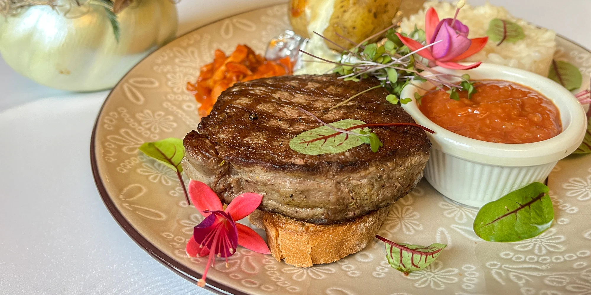 - 200 g Steak New Guinea - hovädzia sviečkovica, anglická slaninka, pikantná omáčka (A: 1, 7) + 200 g Country zemiak s ryžou