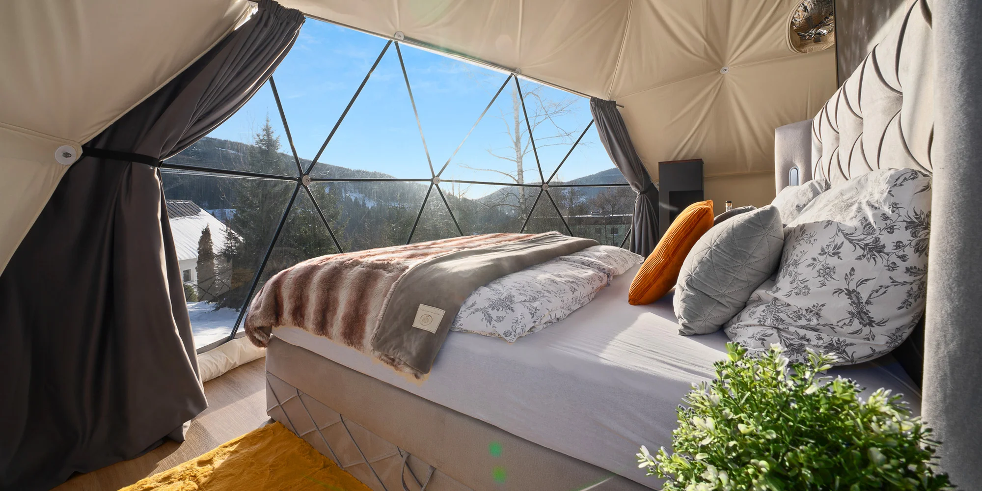 Vaším malým kráľovstvom sa stane glampingový stan, kde sa pohodlne vyspíte v 2–3 osobách. Ráno vás z perín vytiahnu slnečné lúče a panoramatické výhľady na krkonošskú krajinu. Súčasťou vybavenia je vlastná kúpeľňa so sprchou a WC, televízia, Wi‑Fi pripojenie a klimatizácia, ktorá vám príde vhod najmä v teplých mesiacoch.