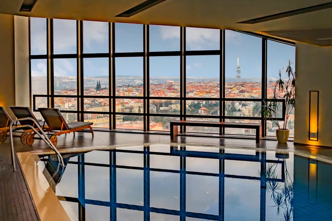 Božský výhľad na Prahu nie je len z izieb, ale aj z hotelového wellness centra. Za vstup sem si môžete priplatiť na recepcii. Nechajte svoje starosti rozpustiť v hrejivej saune a odplávajte na vlnkách elegantného vnútorného bazéna. Oddychovať tu môžete napríklad aj pri masáži, v ponuke je ich celý rad od thajských po lávové kamene.