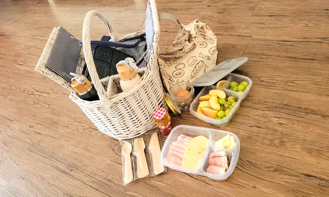 • Raňajkový piknikový kôš (čaj, káva, pečivo, šunka, syr, zelenina, vajíčka, ovocie, jogurt…) pre 2 osoby