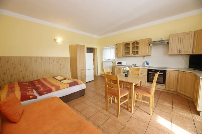 Pripravené sú pre vás izby v dvoch budovách. Izby v prvej budove majú každý svoj samostatný vchod a pred ním stôl, stoličky aj slnečník, čo priamo nabáda k príjemnému posedeniu. Izby s vlastným sociálnym zariadením sú vybavené vstavaným kuchynským kútom, sklokeramickou varnou doskou, mikrovlnnou rúrou, varnou kanvicou, základným riadom a chladničkou.