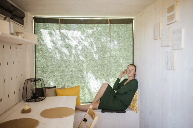 Čo v posede nájdete? Dlhú skladaciu posteľ, ktorá cez deň poslúži ako jedálenský stôl, v noci ako posteľ. Toto miesto je síce na digitálny detox ako stvorené, ale ak si budete chcieť dobiť mobilný telefón, žiadny problém. Využiť môžete nabíjaciu stanicu nabíjanú cez solárny panel.