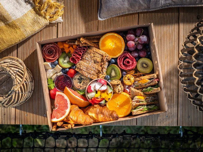 - BOX 1: sendvič (schwarzwaldská šunka, šalát, vajíčko, uhorka, syr, nátierka z čerstvého syra, toastový chlieb), saláma, hermelín, zelený syr, oranžový syr, cookie, 2×croisant, dupletky, tyčinky, džem, humus, chlieb, hrozno, kiwi, pomaranč, jahody, čučoriedky, grep, reďkovka, paprika, uhorka