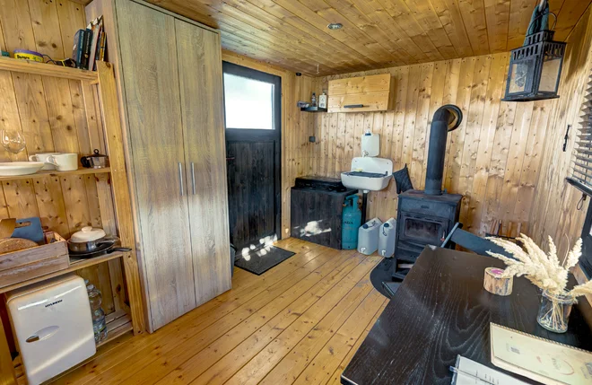 Predstavte si rána s kávou na terase, večery pri krbových kachliach alebo romantické opekanie pri vonkajšom ohnisku… Presne to vás tu čaká! Maringotka je síce úmyselne bez Wi‑Fi, ale ponúka všetko pre nerušený oddych: pohodlné spanie s čistou posteľnou bielizňou pre 2 osoby, minimalistický kuchynský kútik s varičom a cestovnou chladničkou, a dokonca aj stolové hry pre chvíle zábavy.
