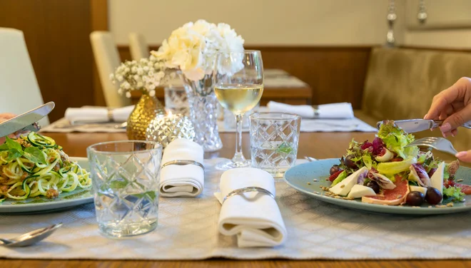 Na večeru sa v hotelovej reštaurácii podáva dvojchodové menu (buď hlavné jedlo s polievkou, alebo s dezertom), ktoré si môžete nechať pripraviť aj vo vegetariánskej variante.