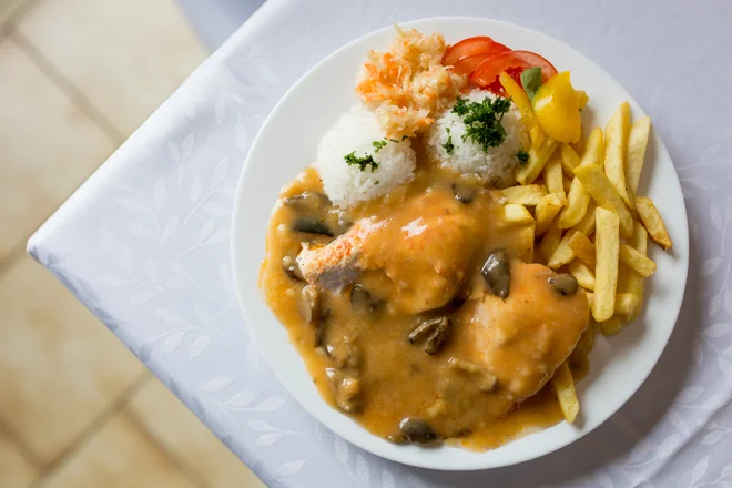 - 230 g Kuracie na hubovej omáčke, 1/2 ryža, 1/2 hranolčeky (A: 1, 3, 7)