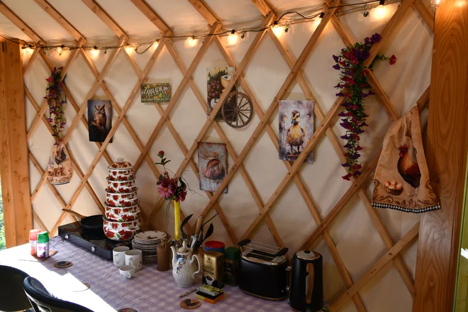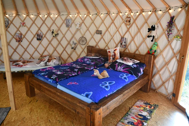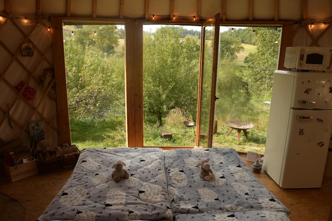 Štýlové jurty na statku vám ponúknu netradičné a pritom komfortné ubytovanie. K dispozícii je jedna manželská a jedna samostatná posteľ. V jurte funguje elektrina, nájdete v nej aj novú retro chladničku, mikrovlnku, toustovač a rýchlovarnú kanvicu, dokonca sa pripojíte na prenosnú Wi‑Fi. Jedlo tak bude vo vašej réžii, no vychutnáte si k nemu aj nádherný výhľad do zelene.