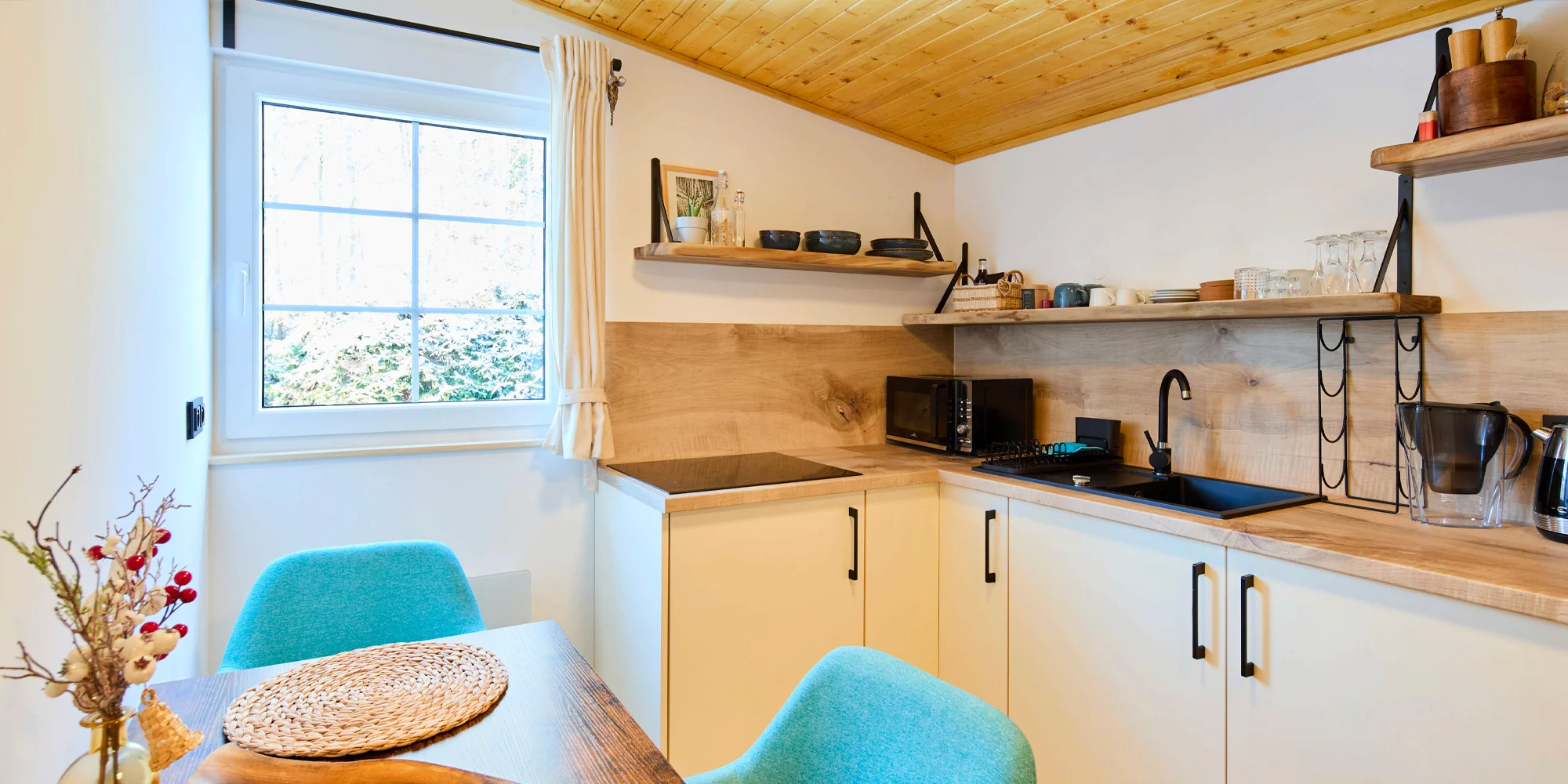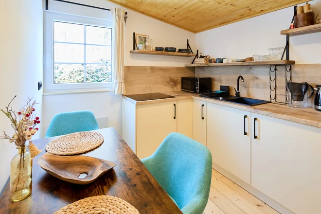 Odpočiniete si v moderne vybavenej chatke s pohodlnou manželskou posteľou. Nebude chýbať ani klimatizácia, TV, Wi‑Fi pripojenie a kachle, ktoré vás nielen zahrejú, ale navodia príjemnú a útulnú atmosféru. K dispozícii budete mať aj kuchyňu, v ktorej vám na prípravu vašich obľúbených dobrôt nebude nič chýbať. Nájdete tu riad, indukčnú dosku aj spotrebiče, ako je napr. mikrovlnná rúra, rýchlovarná kanvica, hriankovač a kávovar. Súčasťou chaty je aj kúpeľňa s WC a sprchovacím kútom.