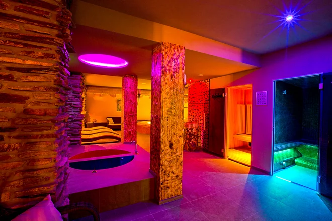 • saunový svet (parná, fínska a infra sauna), vírivka, Kneippov kúpeľ, vonkajšia terasa, ochladzovací bazén, soľná jaskyňa