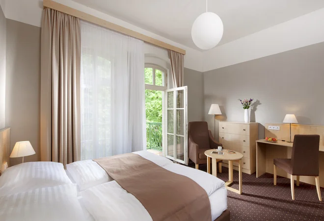 A ako konkrétne je o hostí postarané? V hoteli využívajú miestne zdroje liečivej vody, plynov aj blízkych rašelinísk. Pri pobytoch na 2 noci s procedúrami sú v cene zábaly a kúpeľ a masáž a pri pobyte na 3 noci aj soľná jaskyňa, pri dlhších vás čaká vstupná prehliadka u lekára, ktorý vám na jej základe naplánuje dve procedúry denne.