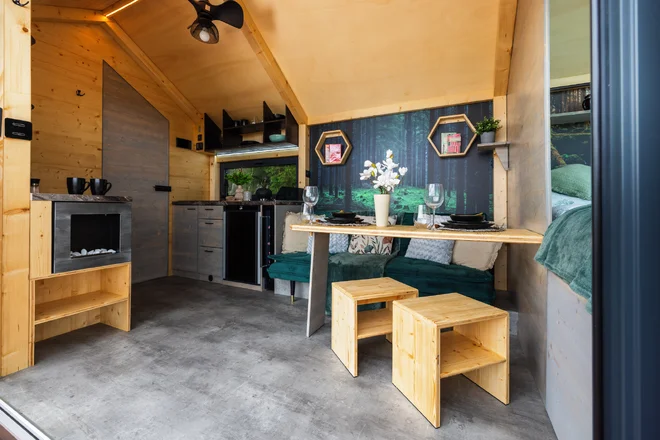 V tiny housoch od firmy Glampino sa môžete ubytovať celoročne, na vykurovanie je tu buď vstavaný krb a ústredné kúrenie, príjemnú klímu v lete zabezpečí stropný ventilátor a hlavne tesná blízkosť lesa, z ktorého prúdi čerstvý vzduch.