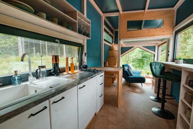 V tiny house nájdete plne vybavenú kuchynku s varnou doskou a french pressom. Priobjednať si môžete aj raňajkový kôš plný dobrôt, na terase potom neváhajte využiť gril. Tvorcovia domčeka mysleli aj na hygienické zázemie. Aj keď budete ďaleko od civilizácie, dáte si teplú sprchu v peknej kúpeľni, kde nechýba ani splachovacie WC.