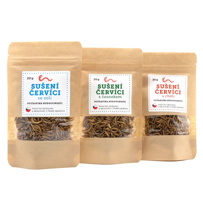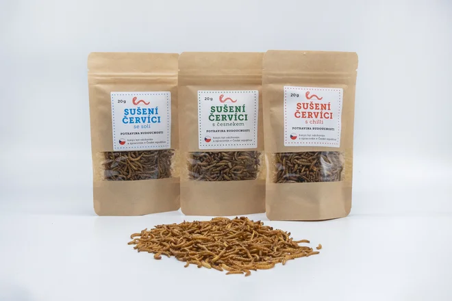 Dobre vedieť: Larvy sú odchovávané v ČR, a to na farme schválenej na chov hmyzu pre ľudskú spotrebu. Všetko prebieha pod kontrolou Štátnej veterinárnej správy a za prísnych hygienických podmienok. Keď larvy dorastú do požadovanej veľkosti, sú rýchlo usmrtené vložením do vriacej vody. Potom sa sušia v horúcom vzduchu.