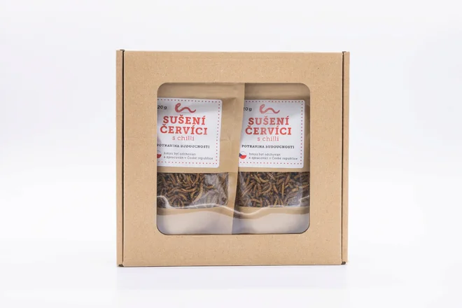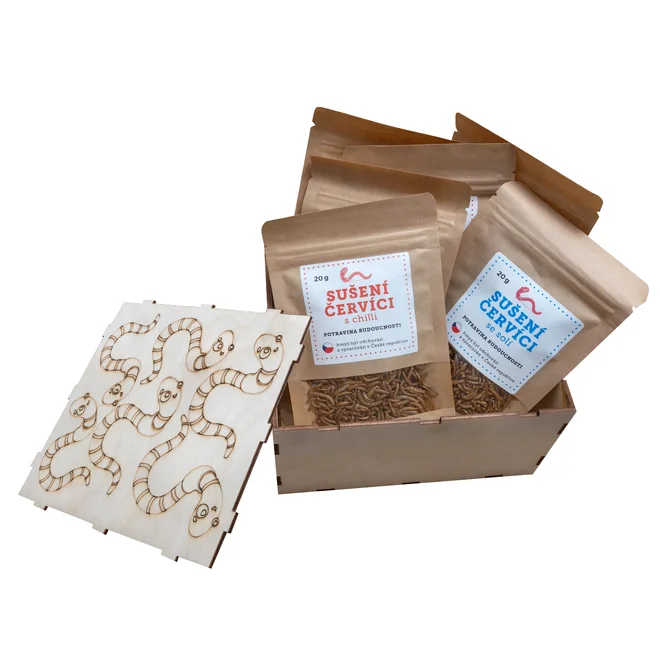 Tip na darček: Máte vo svojom okolí gurmána, ktorý rád skúša nové chute? V ponuke nájdete aj varianty červíkov v kartónovej alebo drevenej darčekovej krabičke.