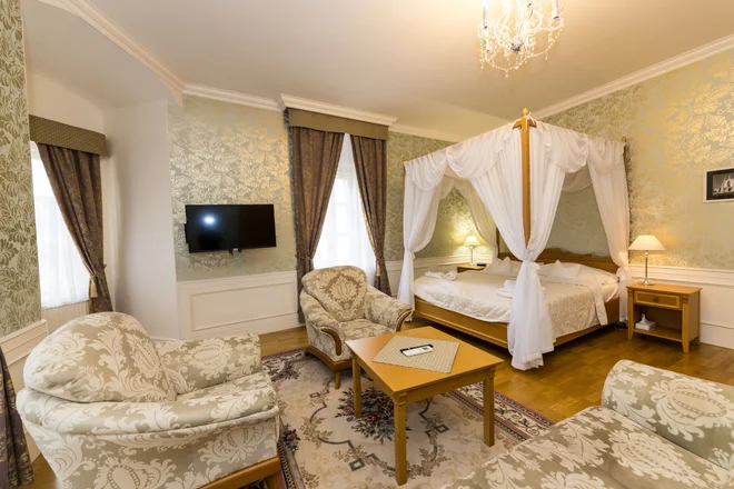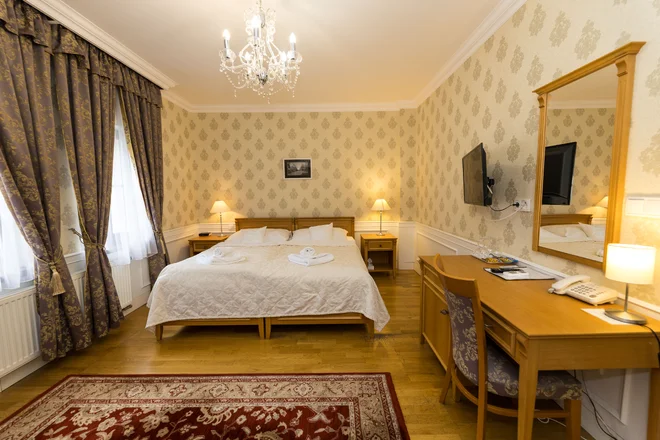 Personál vám pripraví útulnú dvojlôžkovú izbu podľa výberu – zvoliť môžete izbu v podkroví alebo na prvom poschodí, kde je aj možnosť prístelky, prípadne Kniežacie apartmá s posteľou s nebesami. Všetky majú televíziu, chladničku, trezor, Wi‑Fi, pracovný stôl a kúpeľňu s toaletou. V hoteli je výťah, takže nemusíte ísť na poschodie po schodoch.