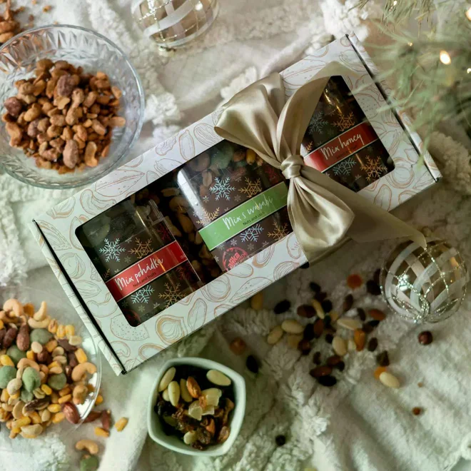 Či už sa rozhodnete pre akúkoľvek zmes, nemusíte sa starať o balenie – všetky orechy sú dodávané v krásnej znovuuzatvárateľnej dóze s elegantnou vianočnou etiketou, ktorá sa rovno hodí na venovanie. A s váhovými variantmi od 450 g až po obrovské 1 550 g je navyše zaručené, že maškrtenie vydrží na naozaj pekných pár dní, možno aj do Nového roka. Chcete dojem ešte vylepšiť? Siahnite po darčekových setoch s kombináciou troch dóz alebo po luxusnom sete, kde je aj fľaša kvalitného vína, ideálna pre slávnostný prípitok.