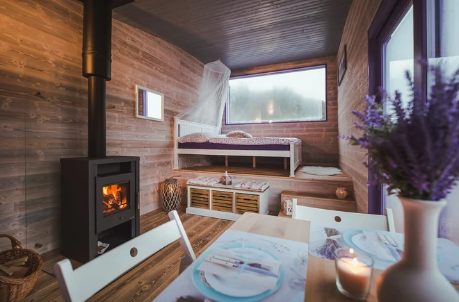 Dominantou každého domčeka je priestranná manželská posteľ doplnená posedením a kachľami na drevo, ktoré máte samozrejme v cene. Samozrejmosťou je posteľná bielizeň, uteráky a základné toaletné potreby. Tie použijete v kúpeľni so sprchovacím kútom a splachovacou toaletou, ktorú nájdete v pešej vzdialenosti (každý domček má kúpeľňu vlastnú). Kúpeľne sú tiež vybavené elektrickými zásuvkami a nájdete tu aj chladničku na uskladnenie potravín.