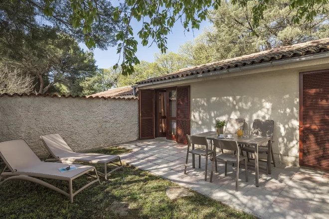 Bude pre vás pripravený prakticky zariadený apartmán pre tri až štyri osoby. Nájdete v ňom pohodlnú manželskú posteľ alebo oddelené lôžka a plne vybavenú kuchynku s varnou doskou, chladničkou a kávovarom. Samozrejmosťou je klimatizácia, trezor, satelitná televízia a bezplatné pripojenie na Wi‑Fi, aby ste zážitky z dovolenky mohli hneď zdieľať do sveta. Kúpeľňa je vybavená vaňou a fénom. Tešte sa tiež na posedenie na terase s výhľadom na borovicový háj.