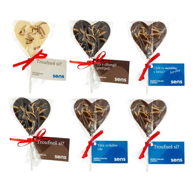Trúfnite si darovať čokolády a lízanky s chrumkavými červíkmi a sledujte, ako sa vaši blízki s touto výzvou popasujú. Hocikto bude najskôr zo začiatku zaskočený, ale verte, že sa nie je čoho báť. Lahodná horká, mliečna alebo biela čokoláda a v nej sem tam nejaký ten červík. Chrumkavá pochúťka, ktorá je navyše úžasným zdrojom bielkovín, prekvapí tým, ako je vlastne v pohode a dobrá.
