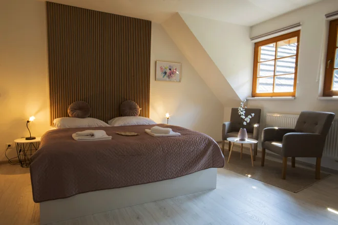 Tešiť sa môžete na útulne zariadené izby, v ktorých sa pohodlne vyspíte a načerpáte energiu. Podľa svojich preferencií a potrieb pokojne zvoľte dvojlôžkovú izbu Štandard, či Štandard Plus s možnosťou prístelky, alebo rodinnú izbu a mezonetový apartmán, v ktorom sa pohodlne vyspia až štyria hostia. Všetky ubytovacie jednotky sú vybavené moderným nábytkom, TV či samostatnou kúpeľňou so sprchovým kútom a toaletou, príjemný bonusom je v niektorých balkón. V celom areáli je tiež bezplatné Wi‑Fi pripojenie na internet a isto vás poteší aj bezplatné parkovanie. V prípade potreby je k dispozícii prebaľovacia miestnosť, rovnako aj postieľka pre deti.