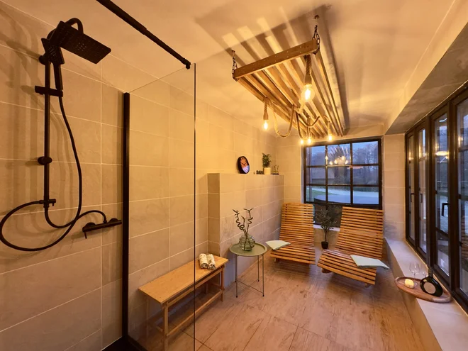 - Vonkajšia vírivka v štýle kúpacieho sudu na drevo, fínska sauna, relaxačná zóna s walk-in sprchovacím kútom