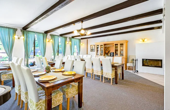 Na prízemí penziónu je spoločenská miestnosť, kde sa každé ráno podávajú raňajky formou bufetu. A keďže je upravená v štýle zámockej jedálne a cez vysoké francúzske okná ponúka božské výhľady, bude vám tu chutiť dvojnásobne. Prípadne sa dá za pekného počasia stolovať aj vonku.