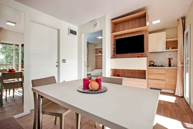 Prenajmete si celý mobilný dom, kam sa zmestí až 8 osôb. Domy sa nachádzajú v blízkosti vonkajších bazénov so slnečnou terasou, z každého sa môžete kochať výhľadom na more. Každý mobilný dom je navyše klimatizovaný, takže si užijete skutočné pohodlie aj v horúcom počasí.