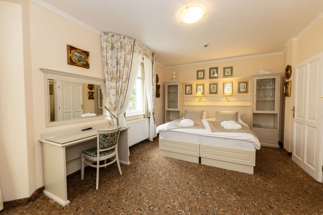 V hoteli si budete užívať intímnu atmosféru, ktorá priamo nabáda k relaxovaniu. Jedinečná poloha umožňuje každodenné pohodlné absolvovanie pitnej kúry pri prameňoch, zároveň budete mať blízko väčšinu pamiatok aj obchodov. Hotel navyše priamo susedí s krásnym barokovým kostolom.