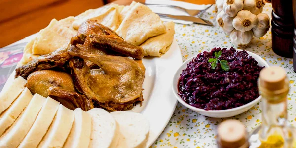 Kačka pečená na drevenom uhlí s lokšami a kapustou