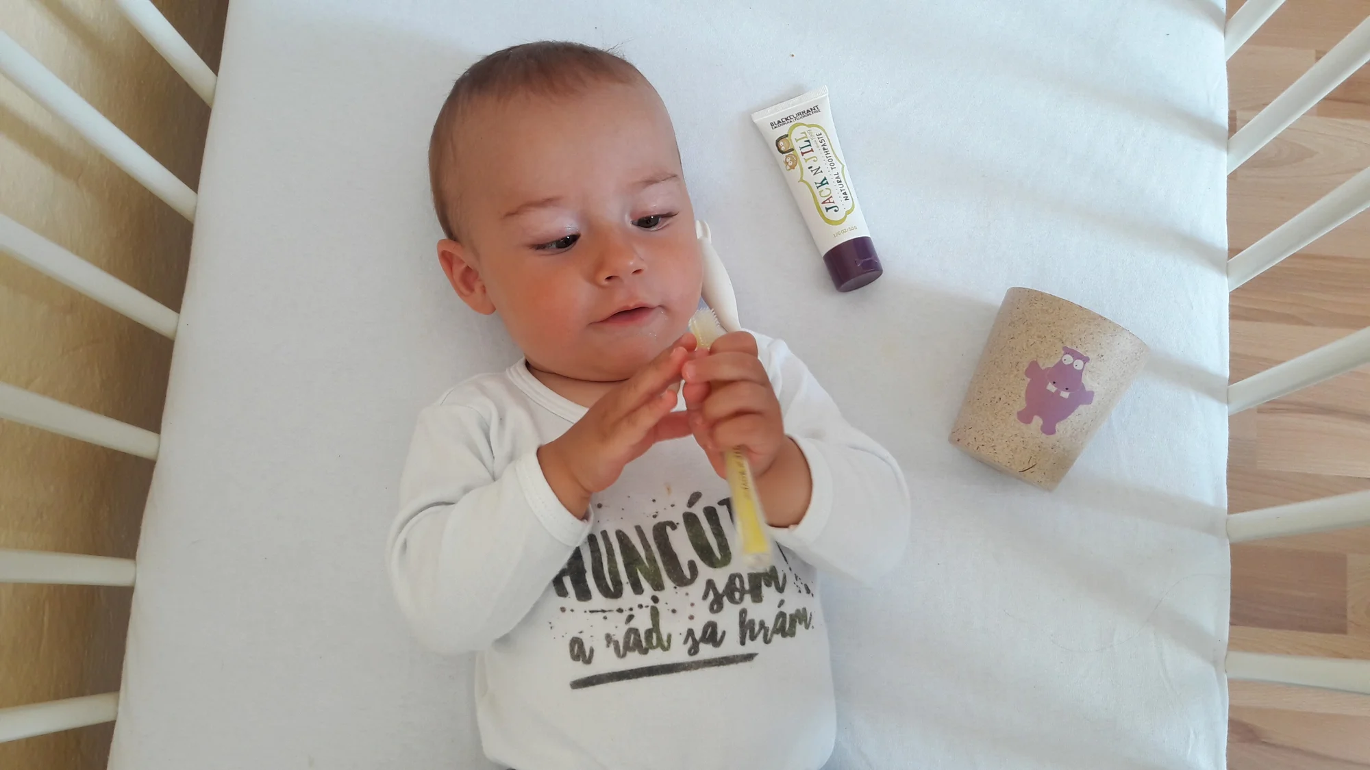 Hneď keď sa s prerezaných čiarok stali ozajstné zúbky sme drobcovi zadovážili prvú zubnú kefku. Toto čistenie bolo skôr o zvyku, ale aj ten bol pre mňa dôležitý. Momentálne máme zubov šesť a rozhodli sme sa vyskúšať Eko dentálny darčekový set od Jack N´ Jill vhodný aj na prvé zúbky.