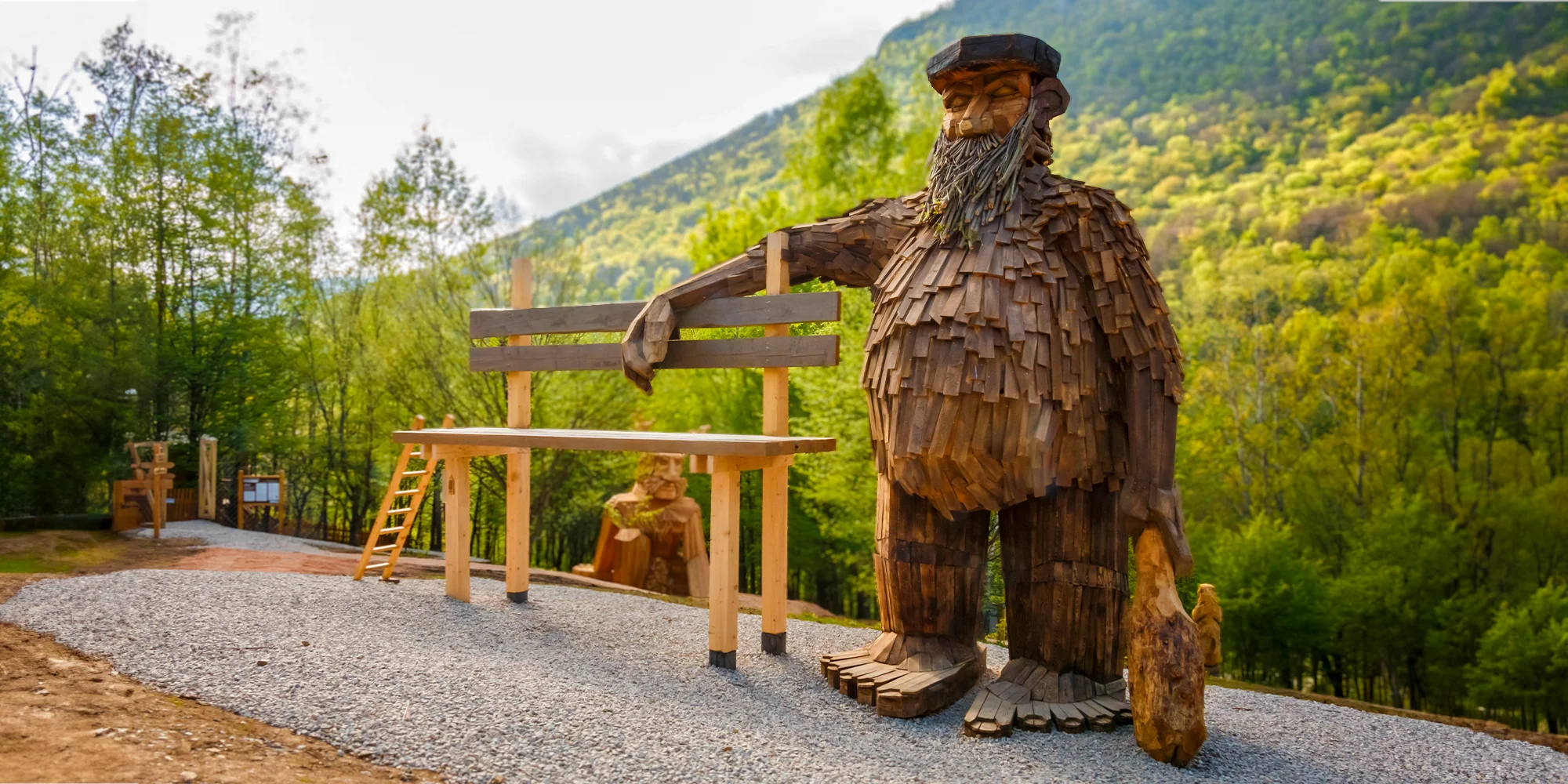 Obrovské sochy vo výške až 7 až 9 metrov vyrobili majstri rezbári z Česka, niektoré vážia až 5 ton. Nájdete tu obrov menom Leši, Machoš, Bažur, obriu sovu Széchy a ďalších drevených sympaťákov. Inšpiráciou pre vznik parku bola najmä tajuplná slovanská mytológia a tiež vedecko-fantastická kniha miestneho rodáka Gustáva Reussa Hviezdoveda.