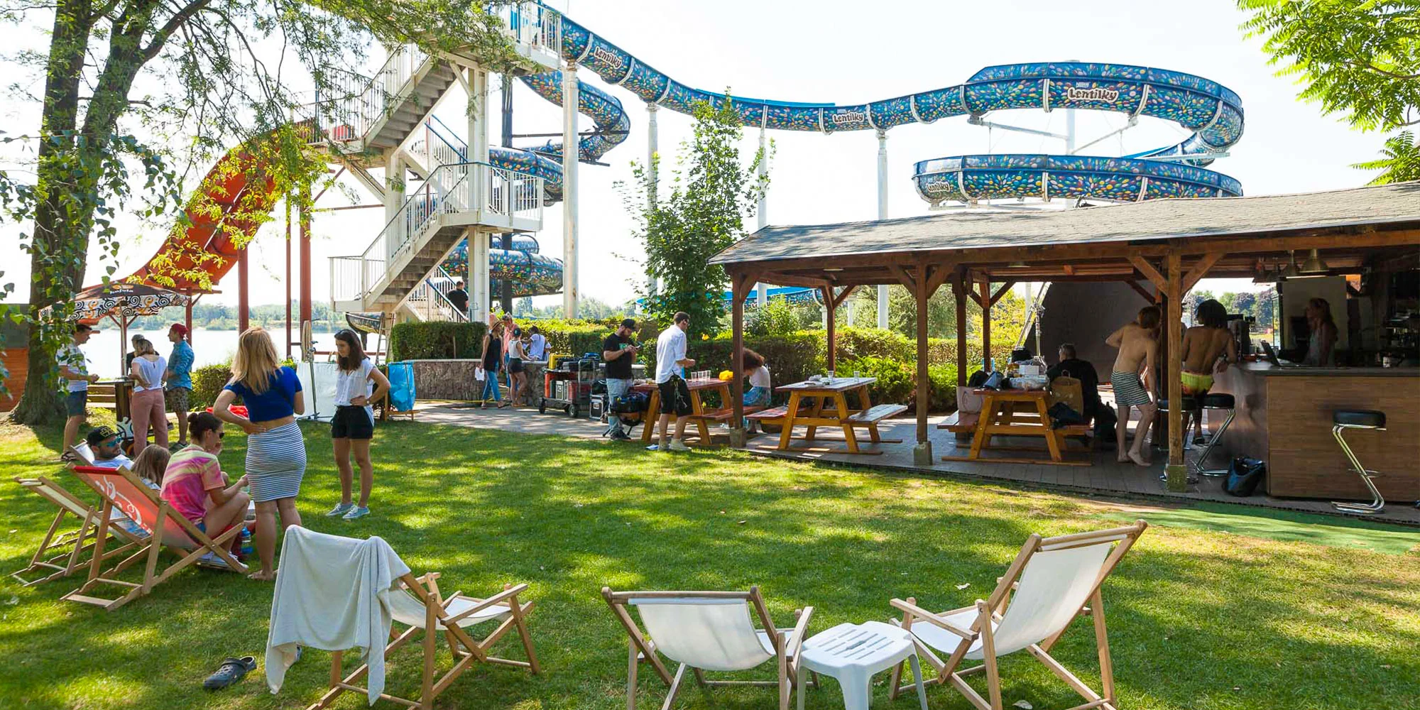 ZanziBar je oplotený priestor, ktorý má k dispozícii šmykľavku do jazera a dva tobogany s malým bazénom, barový pultík, kde vám pripravia vaše nápoje rôzneho druhu a kuchyňu. V rámci oploteného areálu si môžete prenajať lehátko, vďaka ktorému máte komfort a pohodu celá deň na dosah. Pre malé deti, ktoré nemôžu ísť na tobogany, je ponúknutá malá náhrada vo forme trampolínky. Záujemci o paddleboard majú možnosť použitia všetkého potrebného a každý ocení možnosť uloženia vecí do skriniek. Nás potešila originál kofolku, ktorú sme dostali na náš voucher spolu s lehátkom.