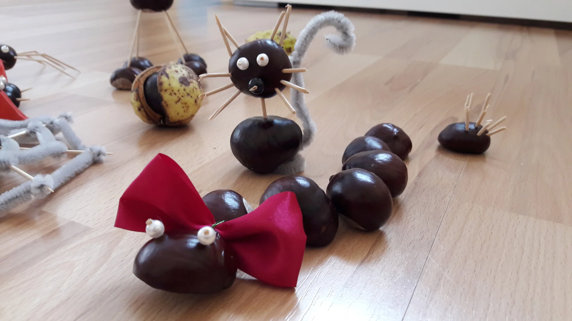 Zbieraním zábava nekončila. Doma sa pokračovalo. Tentokrát sme mali v ceste len gaštany, tak sme k nim vytiahli korálky, špajdle, drôtiky, chlpaté drôtiky, mašle… čokoľvek čo doma nájdete a začalo sa tvoriť. Až po chvíľke som si spomenula, že je potrebný „klinec“ na robenie dierok. Všetko sním ide podstatne jednoduchšie a špajle/hrubšie špáradlá sa lámu určite menej. Po chvíľke sa nám začala tvoriť malá gaštanová ZOO. Prvý nám pribudol ježko, potom pavúk, mačička, koník, chrobáčik, stonožko/hadík, proste celý zverinec.