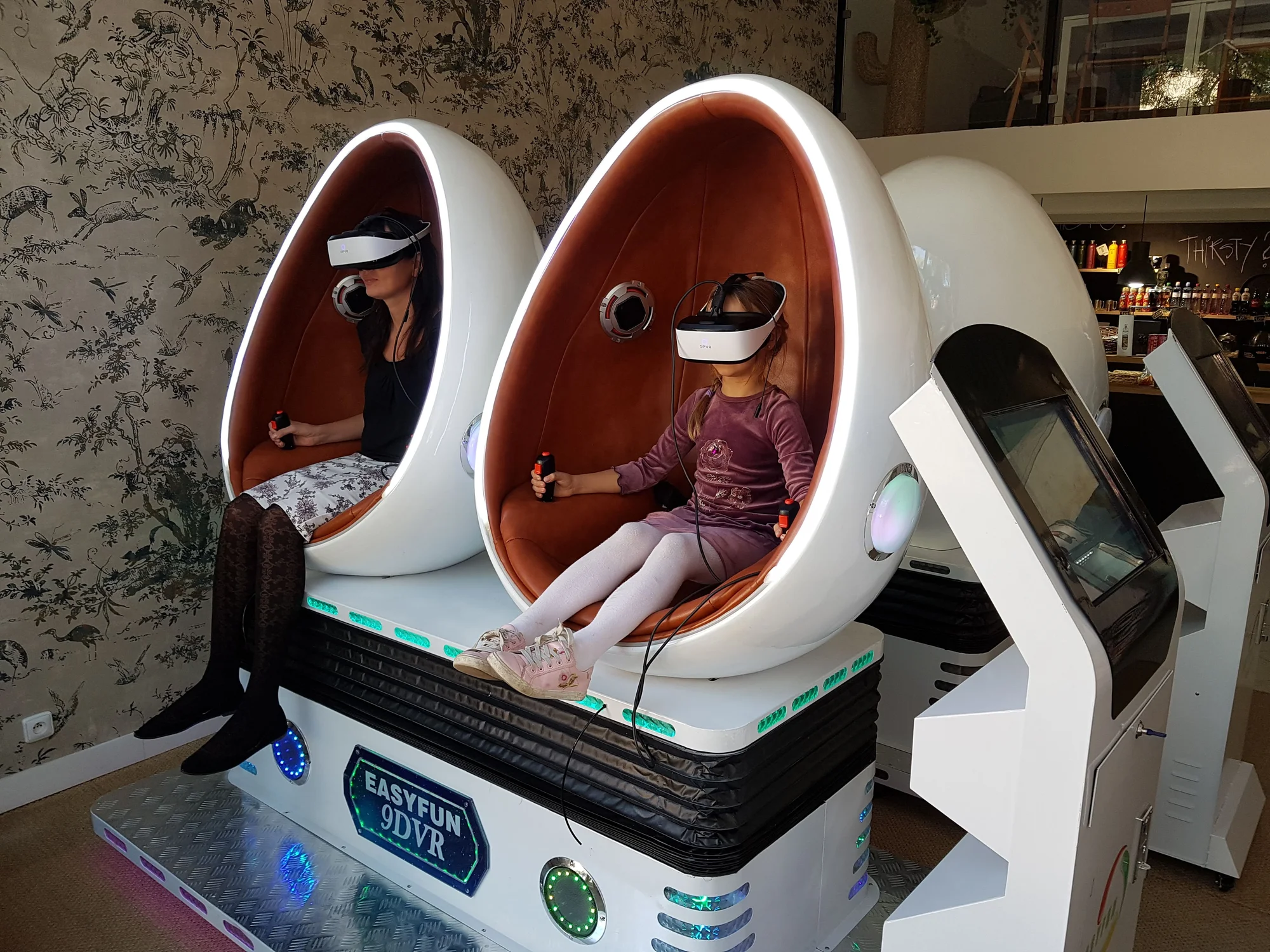 Hneď ako sme vstúpili do miestnosti, prišiel nás obslúžiť mladý chalan a poradil nám, čo si vybrať. Keďže sme mali testovaciu jazdu pre dvoch, tak si sadli obidvaja synovia do sedačiek naraz, ktoré vyzerali ako vajíčka. Dostali na oči špeciálne okuliare a chvíľu nevideli nič, no vzápätí sa ocitli na kolotoči a lietali hore dole, padali dolu hlavou, no v skutočnosti sa s nimi sedadlo trochu triaslo, vibrovalo, fúkal na nich vzduch… na tvári sa im striedalo prekvapenie, úľak, smiech… My sme mohli zatiaľ sledovať na malej obrazovke, kde sa asi nachádzajú a čo vidia.