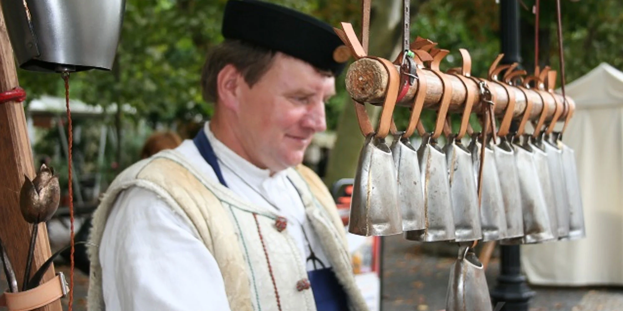 Stanislav Otruba a jeho zvonkohra na remeselných trhoch.