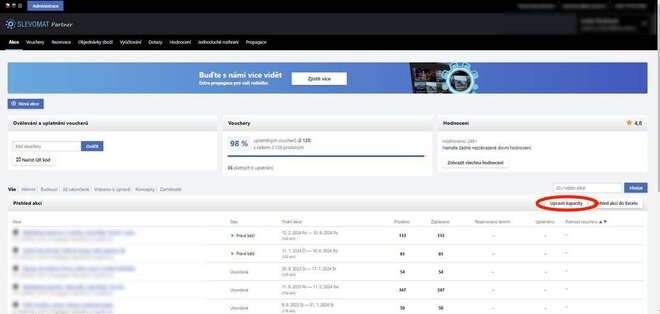 Rádi bychom vás upozornili, že možnost navýšení kapacity zatím není dostupná pro partnery, kteří používají vlastní kódy voucherů.